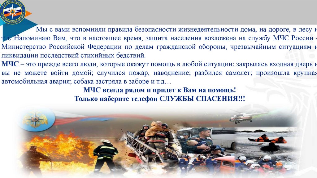 Мы с вами вспомнили правила безопасности жизнедеятельности дома, на дороге, в лесу ит.д. Напоминаю Вам, что в настоящее время, защита населения возложена на службу МЧС России Министерство Российской Федерации по делам гражданской обороны, чрезвычайным ситуациям и