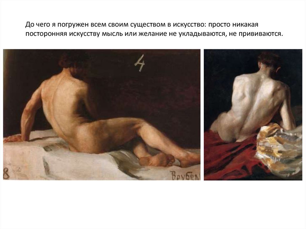 До чего я погружен всем своим существом в искусство: просто никакаяпосторонняя искусству мысль или желание не укладываются, не прививаются.