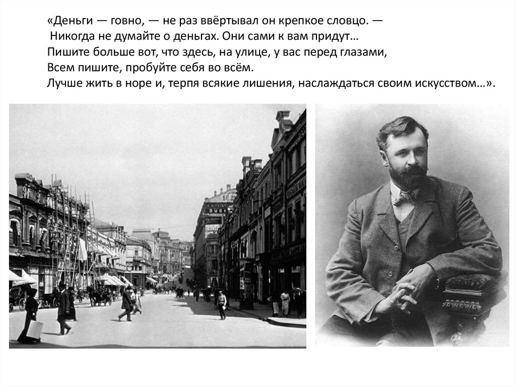 «Деньги — говно, — не раз ввёртывал он крепкое словцо. —Никогда не думайте о деньгах. Они сами к вам придут…