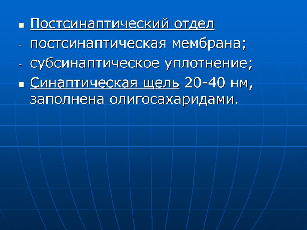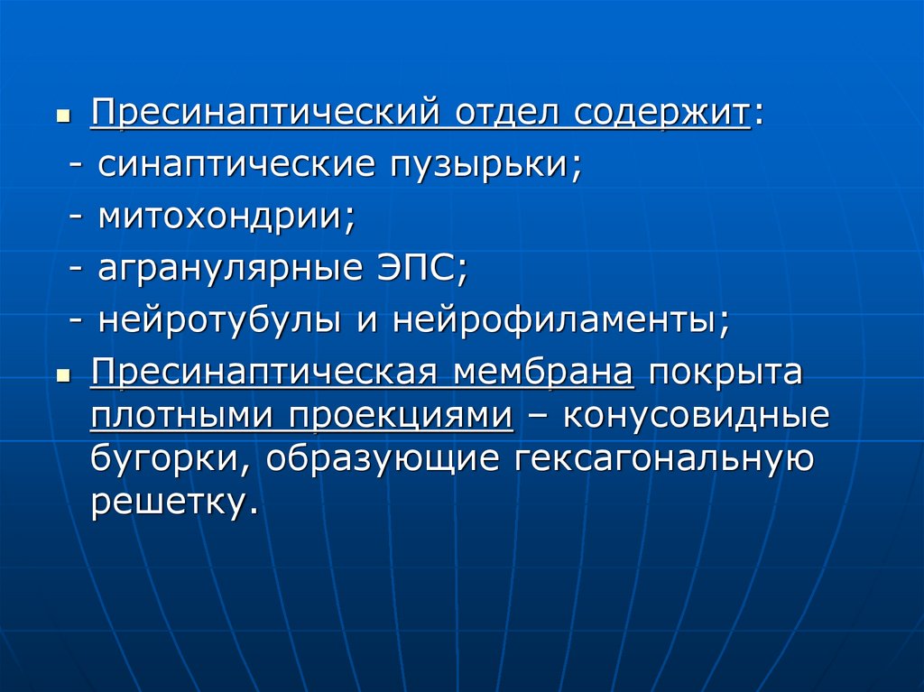 Пресинаптический отдел содержит:- синаптические пузырьки;