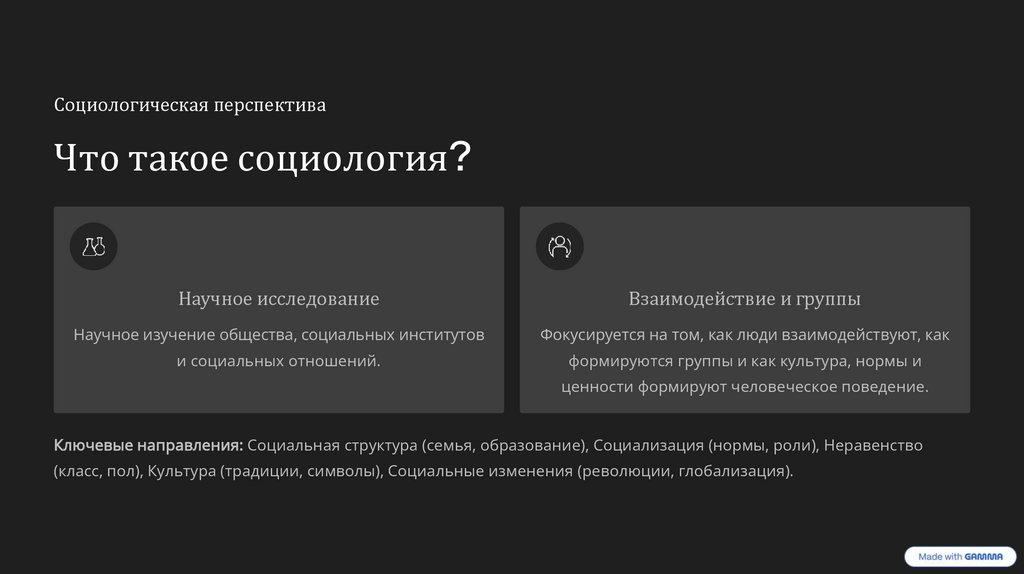 Ключевые направления: Социальная структура (семья, образование), Социализация (нормы, роли), Неравенство