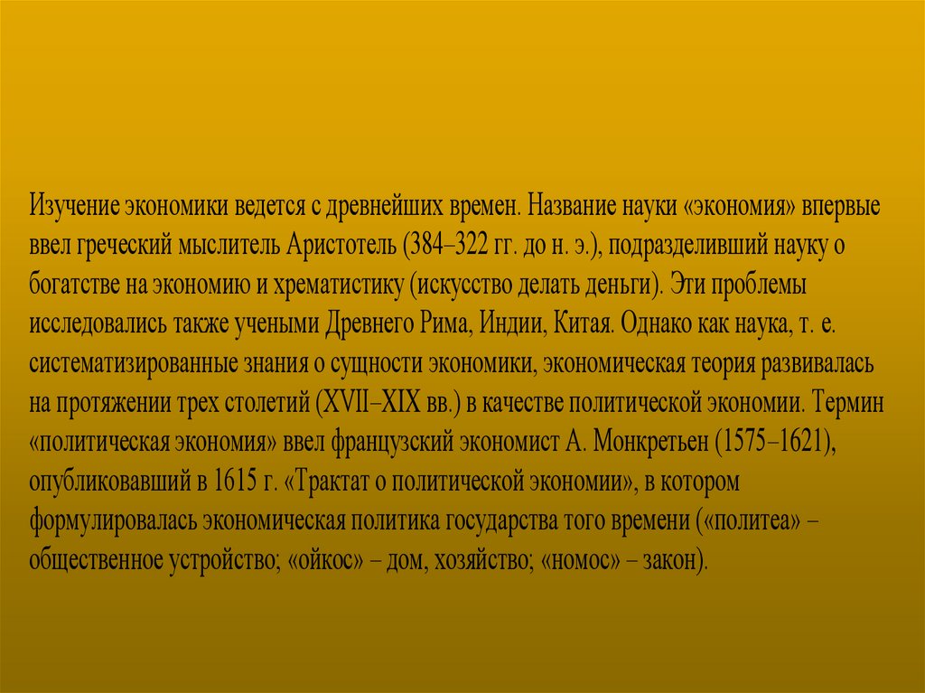 Изучение экономики ведется с древнейших времен. Название науки «экономия» впервыеввел греческий мыслитель Аристотель (384–322 гг. до н. э.), подразделивший науку о