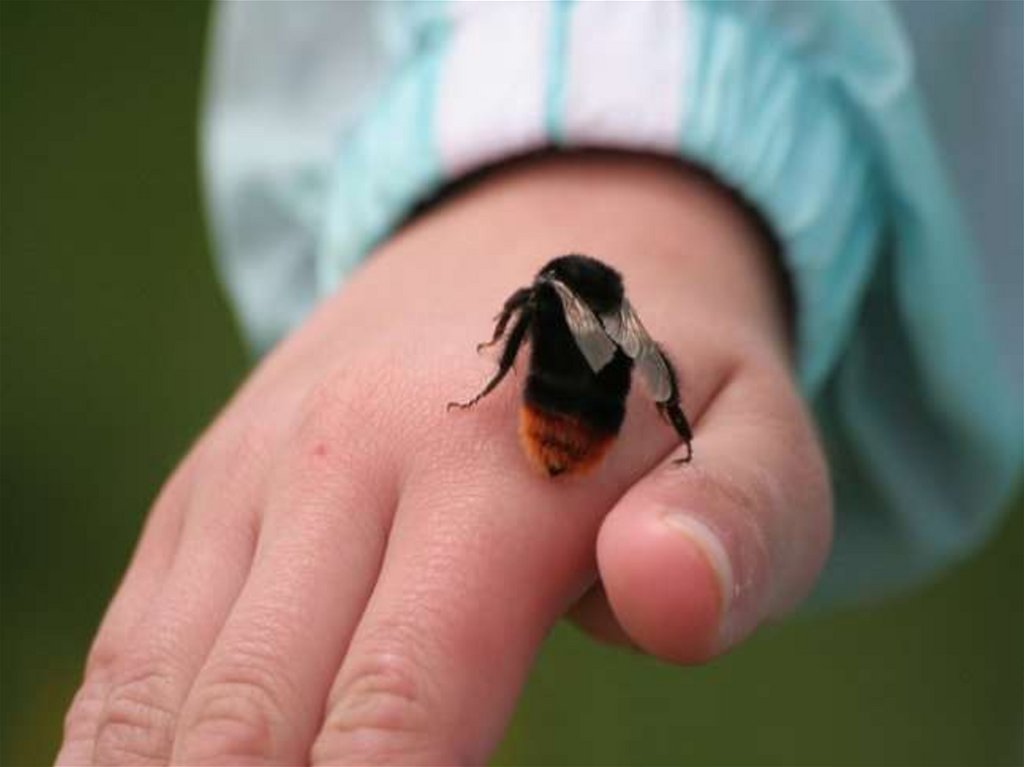 • Удалить жало пчелы из кожи, прижав егоногтями больших пальцев и стараясь не