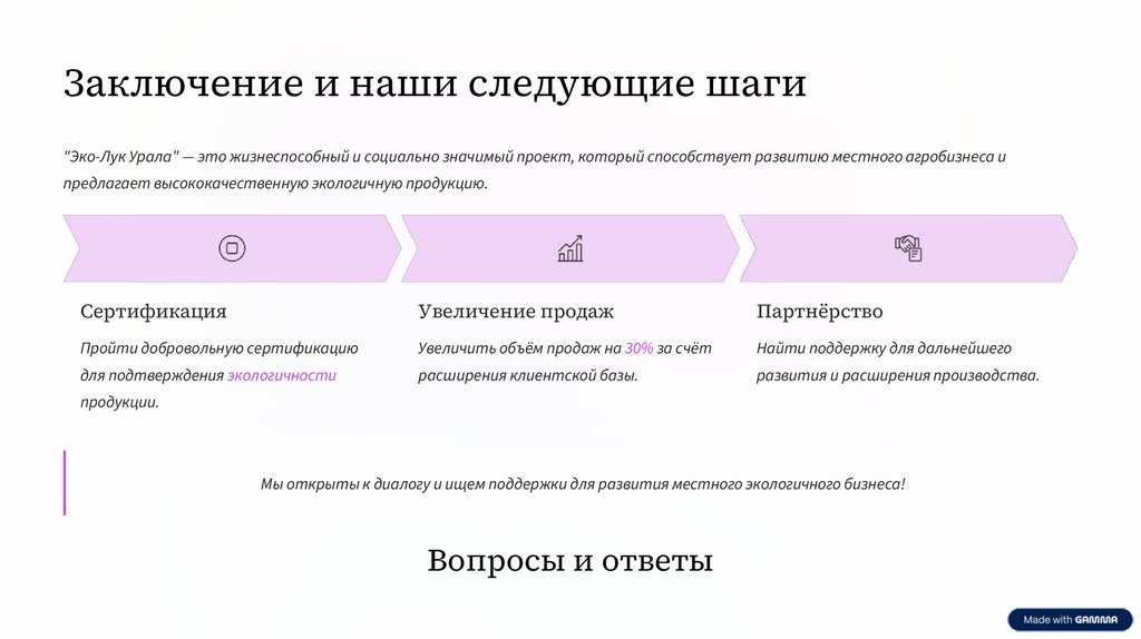 Заключение и наши следующие шаги"Эко-Лук Урала" — это жизнеспособный и социально значимый проект, который способствует развитию местного агробизнеса и