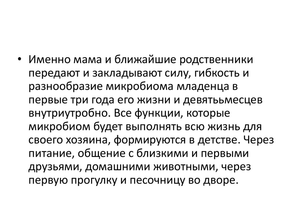 • Первичная микробиота Наследуется поматеринской линии (мама, бабушка)