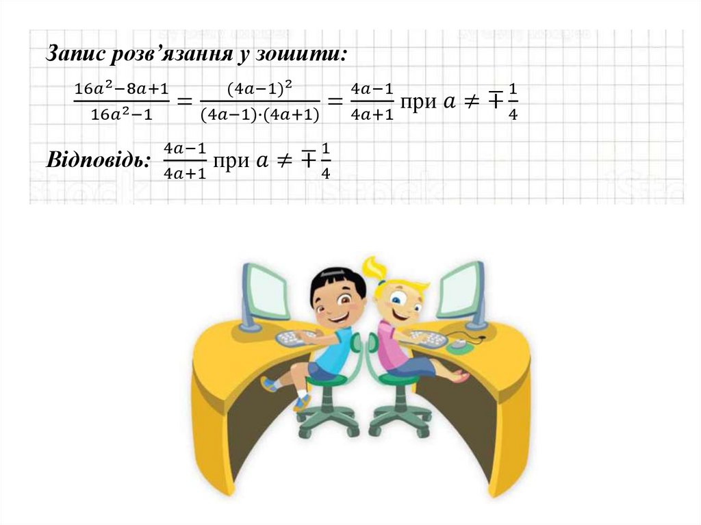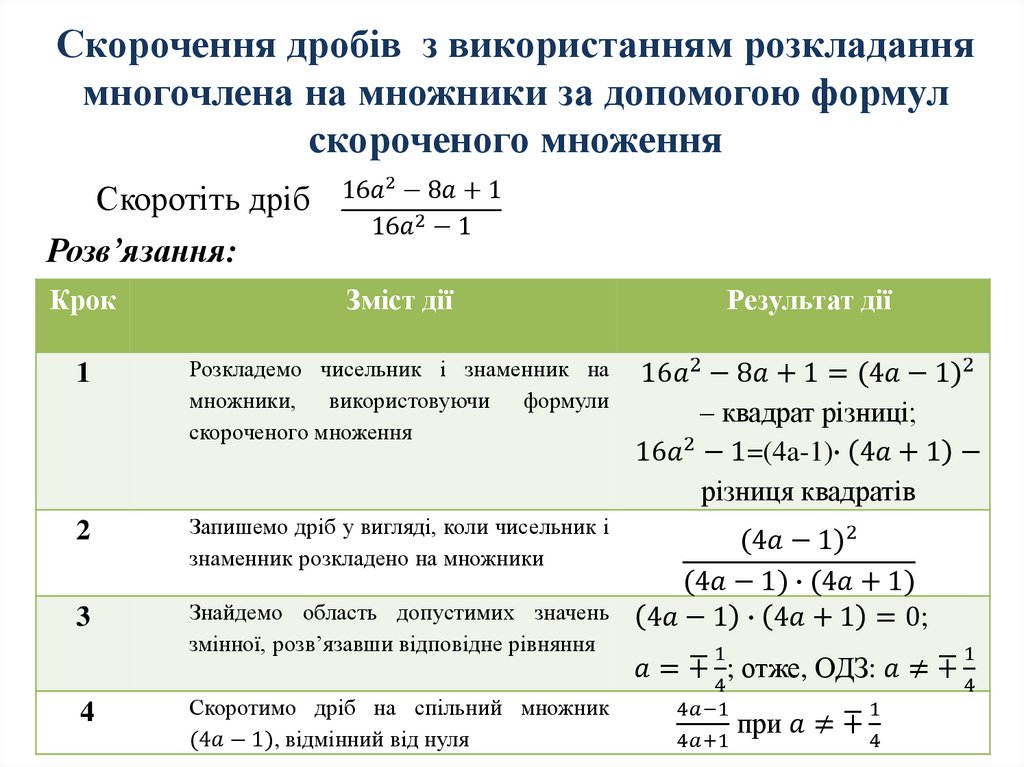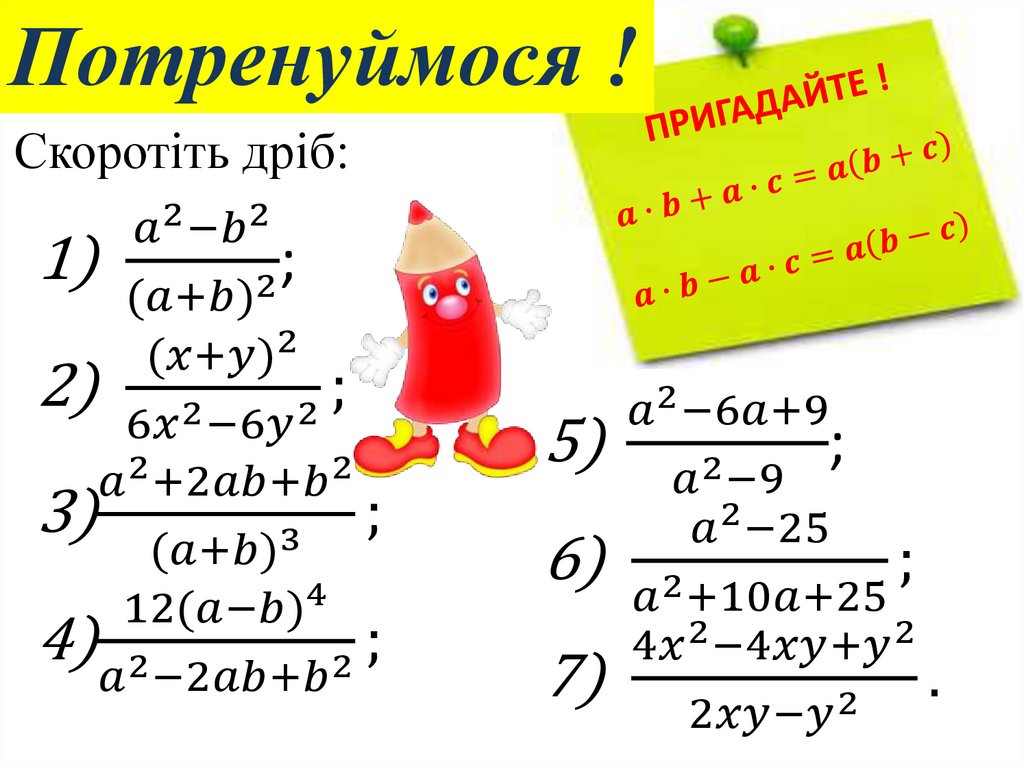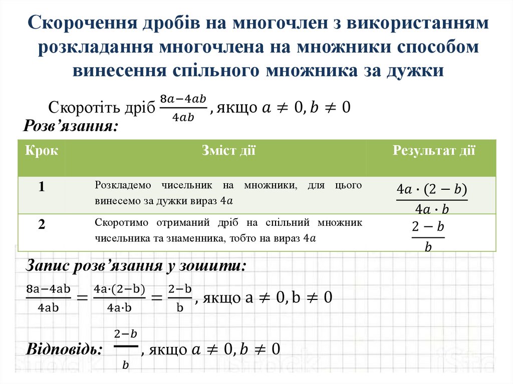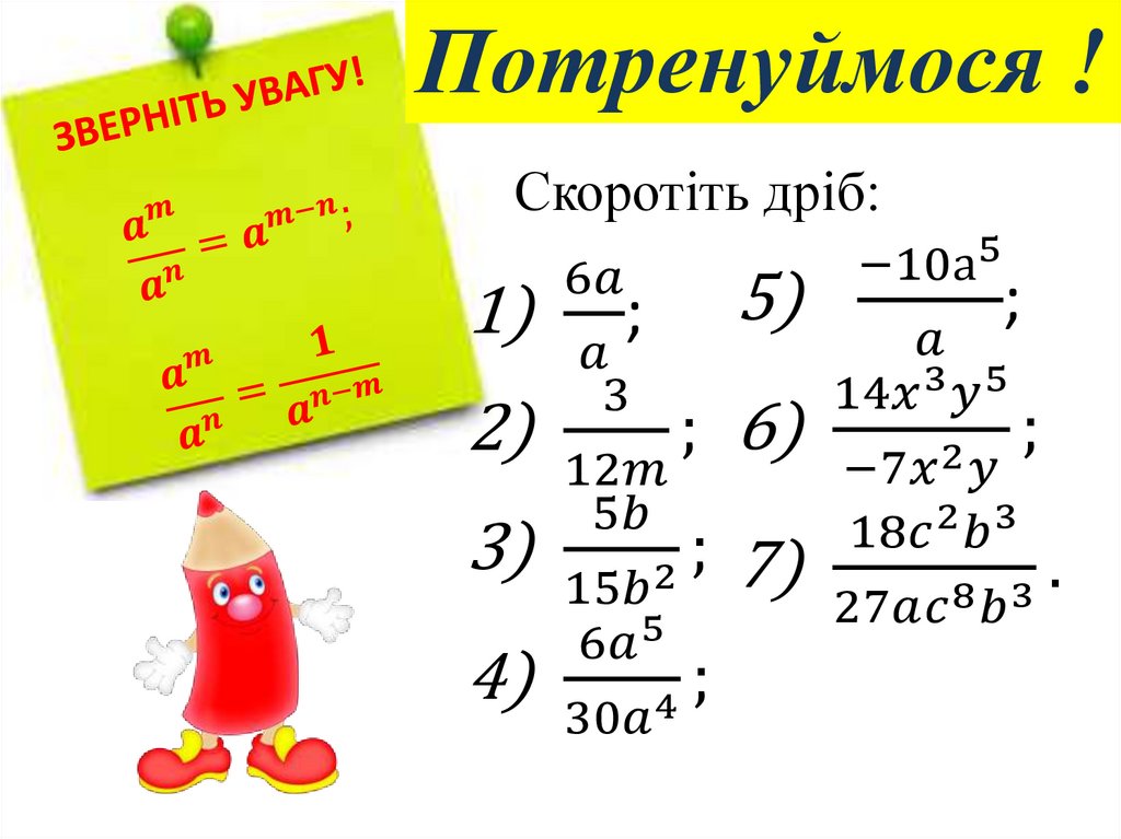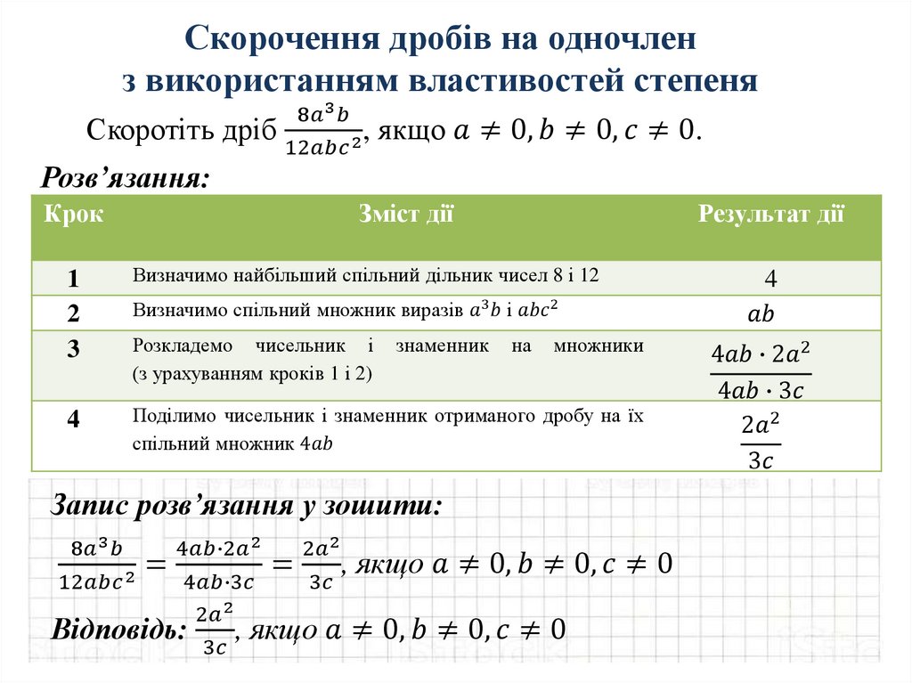 Скорочення дробів на одночленз використанням властивостей степеня