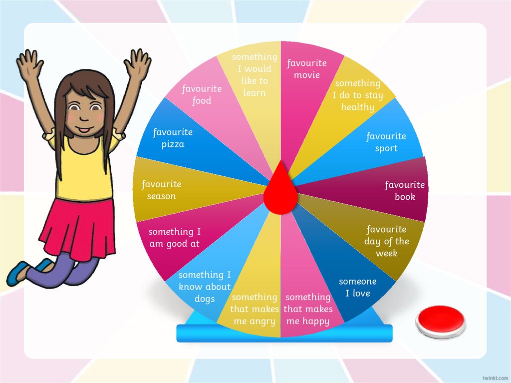 This ‘facts about me’ spinner is completely editable. You can use it in anumber of different ways. Put in prompts for your students then spin the