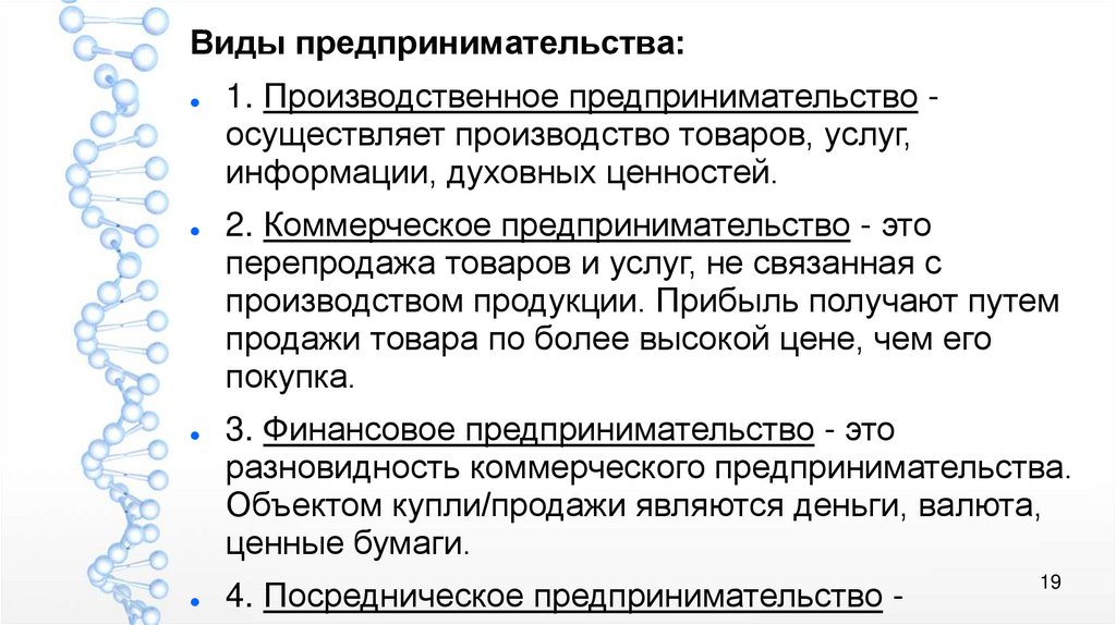 Виды предпринимательства:1. Производственное предпринимательство осуществляет производство товаров, услуг,