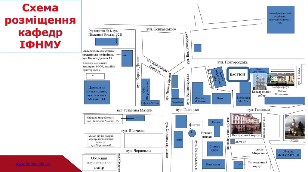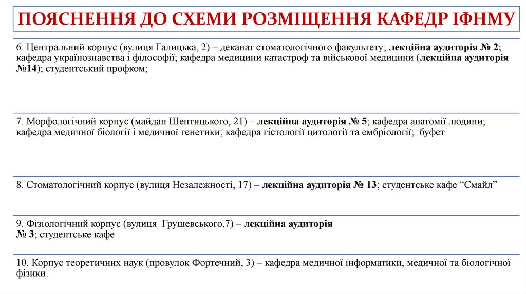 ПОЯСНЕННЯ ДО СХЕМИ РОЗМІЩЕННЯ КАФЕДР ІФНМУ6. Центральний корпус (вулиця Галицька, 2) – деканат стоматологічного факультету; лекційна аудиторія № 2;