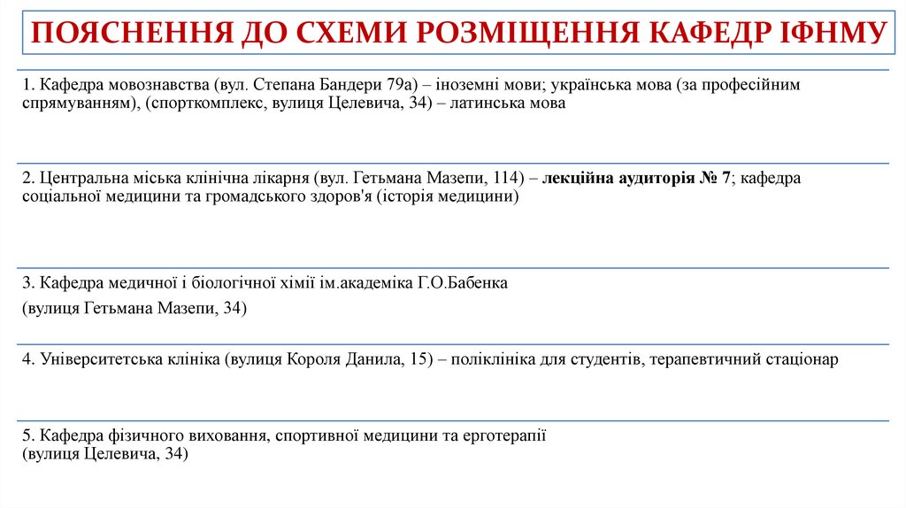 ПОЯСНЕННЯ ДО СХЕМИ РОЗМІЩЕННЯ КАФЕДР ІФНМУ1. Кафедра мовознавства (вул. Степана Бандери 79а) – іноземні мови; українська мова (за професійним