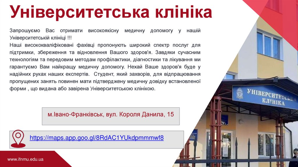 4. Університетська клініка (вулиця Короля Данила, 15) – поліклініка для студентів, терапевтичний стаціонар
