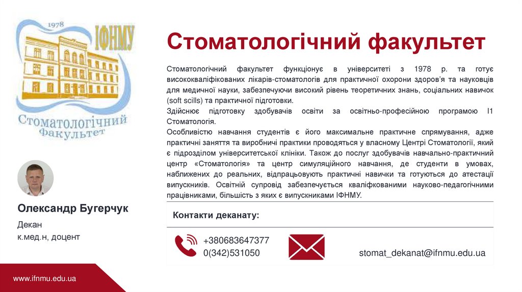 Стоматологічний факультетСтоматологічний факультет функціонує в університеті з 1978 р. та готує