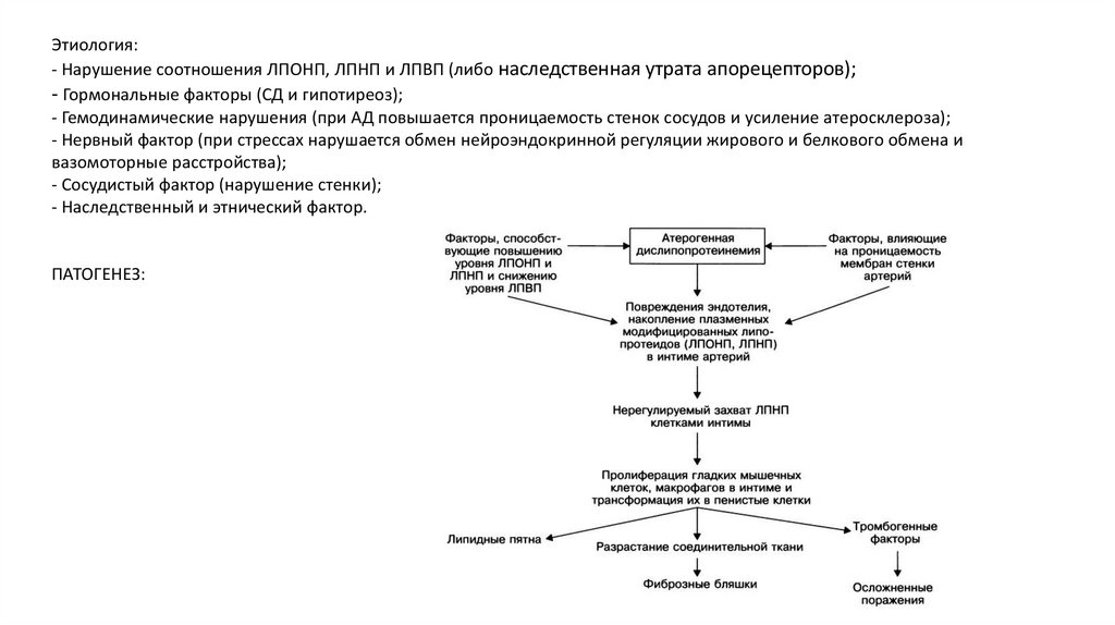 Этиология:- Нарушение соотношения ЛПОНП, ЛПНП и ЛПВП (либо наследственная утрата апорецепторов);
