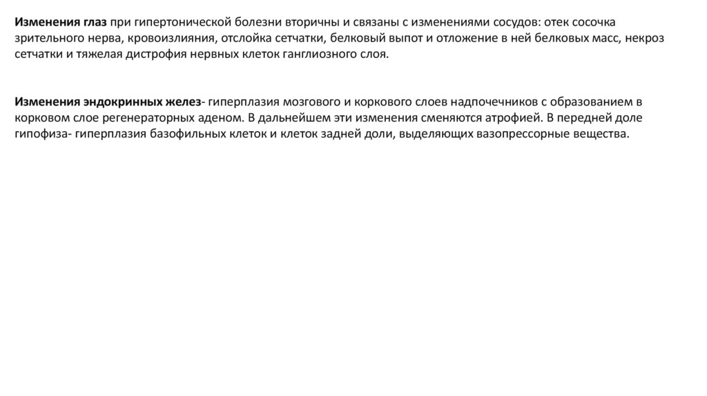 Изменения глаз при гипертонической болезни вторичны и связаны с изменениями сосудов: отек сосочказрительного нерва, кровоизлияния, отслойка сетчатки, белковый выпот и отложение в ней белковых масс, некроз