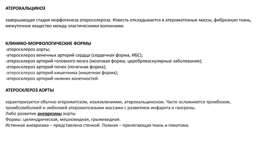 АТЕРОКАЛЬЦИНОЗзавершающая стадия морфогенеза атеросклероза. Известь откладывается в атероматозные массы, фиброзную ткань,