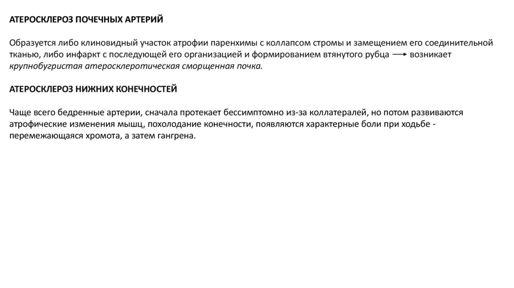 АТЕРОСКЛЕРОЗ ПОЧЕЧНЫХ АРТЕРИЙОбразуется либо клиновидный участок атрофии паренхимы с коллапсом стромы и замещением его соединительной
