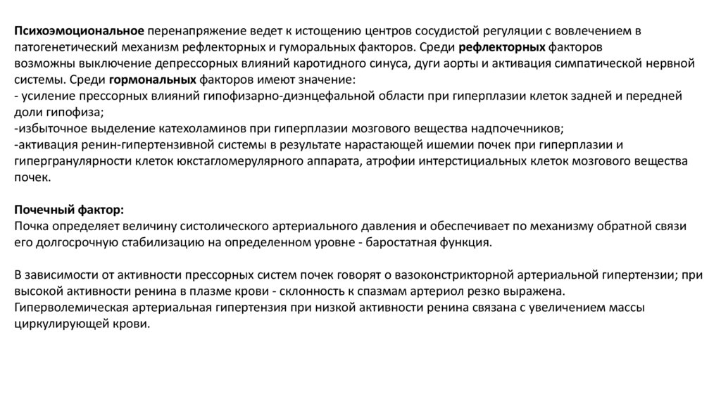 В зависимости от активности прессорных систем почек говорят о вазоконстрикторной артериальной гипертензии; при