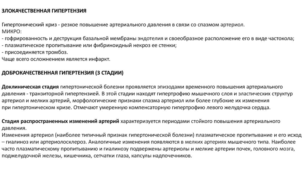 Изменения артериол (наиболее типичный признак гипертонической болезни) плазматическое пропитывание и его исход