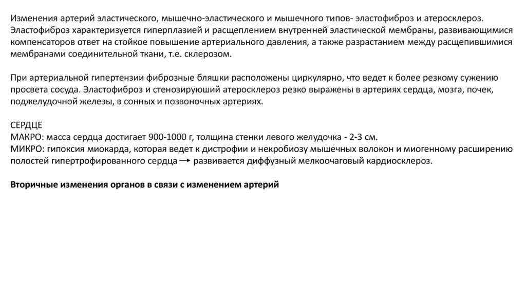 Изменения артерий эластического, мышечно-эластического и мышечного типов- эластофиброз и атеросклероз.Эластофиброз характеризуется гиперплазией и расщеплением внутренней эластической мембраны, развивающимися