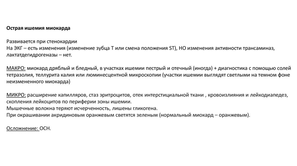 МАКРО: миокард дряблый и бледный, в участках ишемии пестрый и отечный (иногда) + диагностика с помощью солей