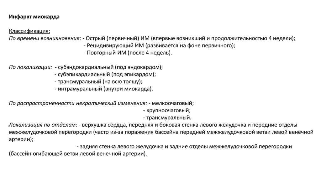 По времени возникновения: - Острый (первичный) ИМ (впервые возникший и продолжительностью 4 недели);