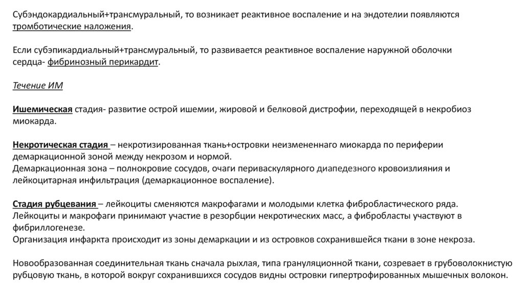 Субэндокардиальный+трансмуральный, то возникает реактивное воспаление и на эндотелии появляютсятромботические наложения.