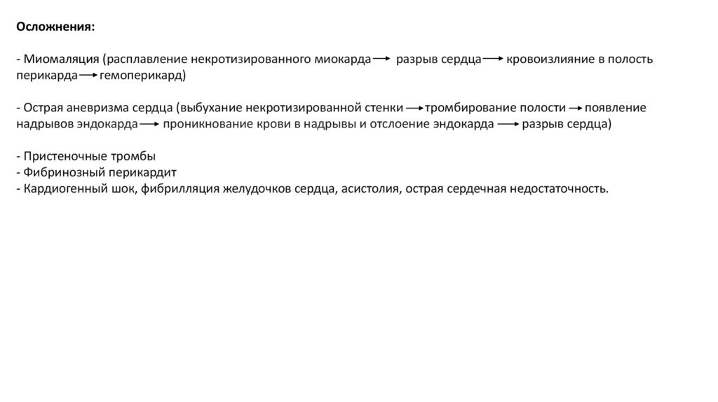 Осложнения:- Миомаляция (расплавление некротизированного миокарда