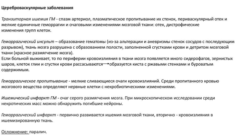 Цереброваскулярные заболеванияТранзиторная ишемия ГМ - спазм артериол, плазматическое пропитывание их стенок, периваскулярный отек и