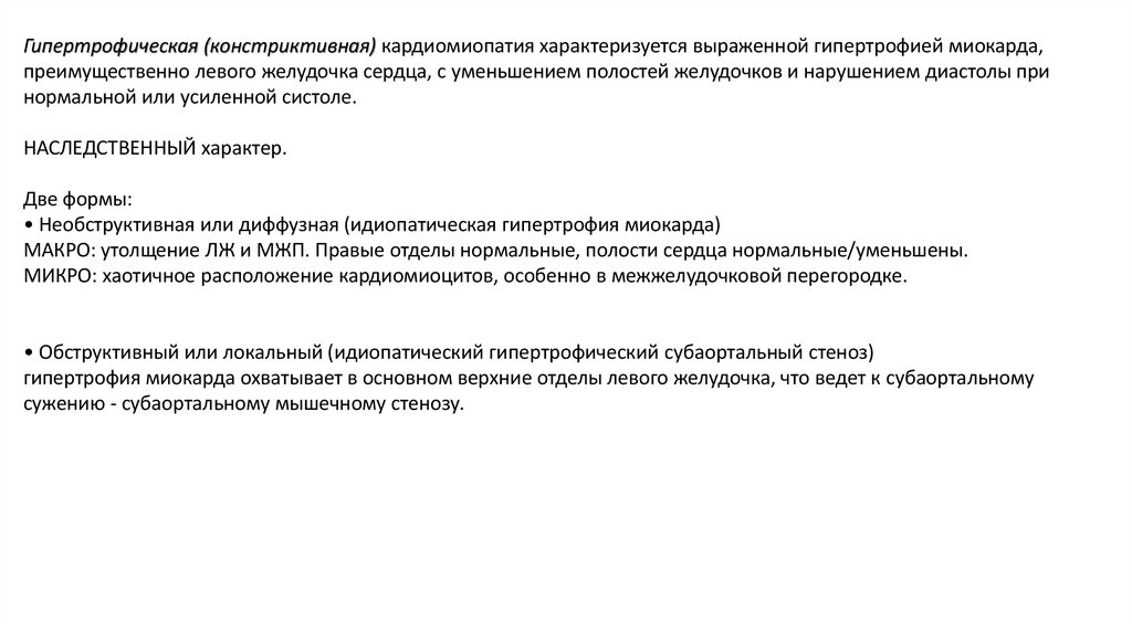 Гипертрофическая (констриктивная) кардиомиопатия характеризуется выраженной гипертрофией миокарда,преимущественно левого желудочка сердца, с уменьшением полостей желудочков и нарушением диастолы при
