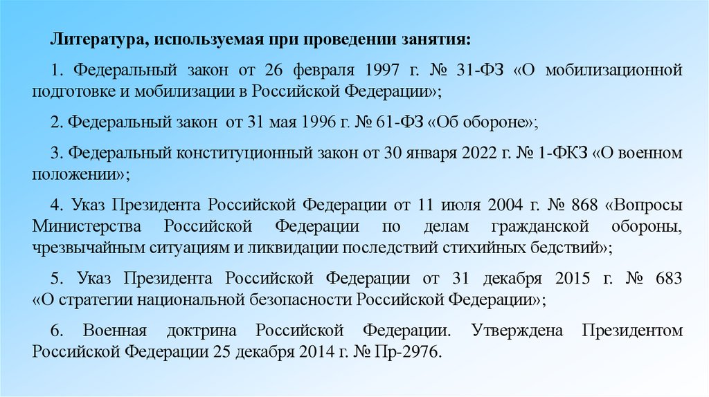 Литература, используемая при проведении занятия:1. Федеральный закон от 26 февраля 1997 г. № 31-ФЗ «О мобилизационной