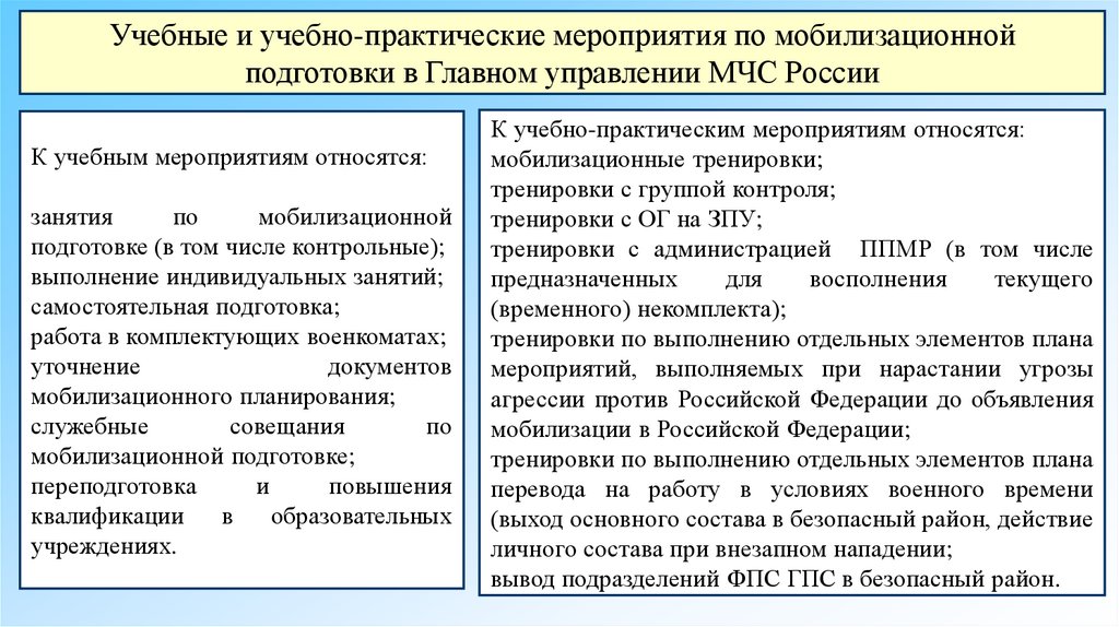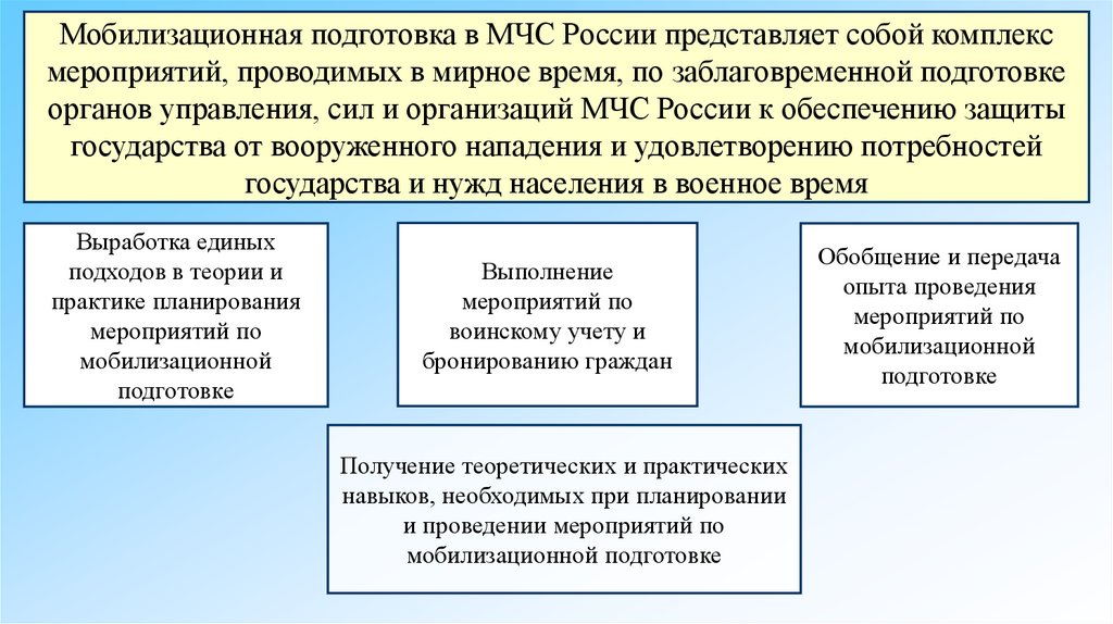 Мобилизационная подготовка в МЧС России представляет собой комплексмероприятий, проводимых в мирное время, по заблаговременной подготовке