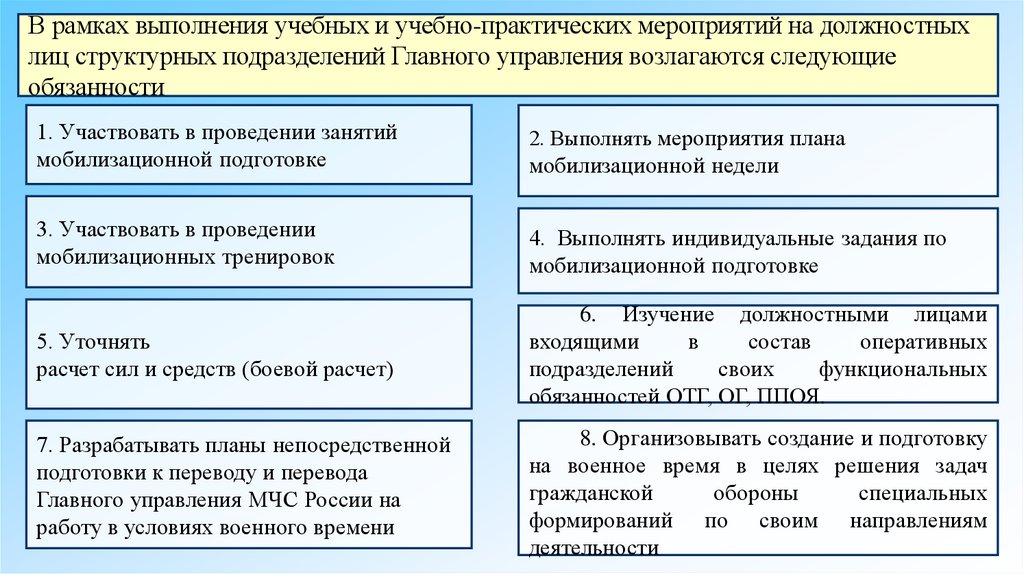 В рамках выполнения учебных и учебно-практических мероприятий на должностныхлиц структурных подразделений Главного управления возлагаются следующие