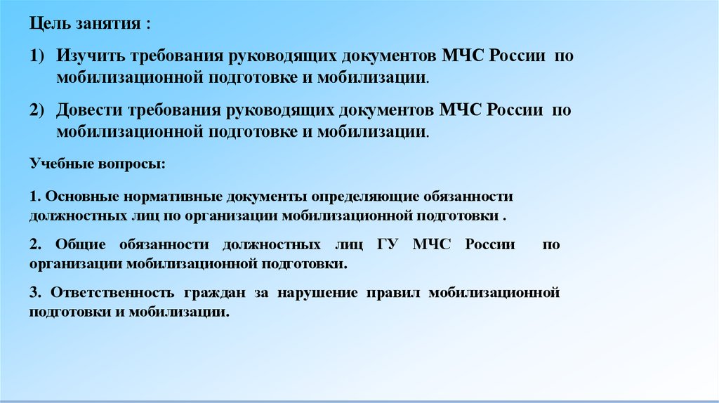 Цель занятия :1) Изучить требования руководящих документов МЧС России по