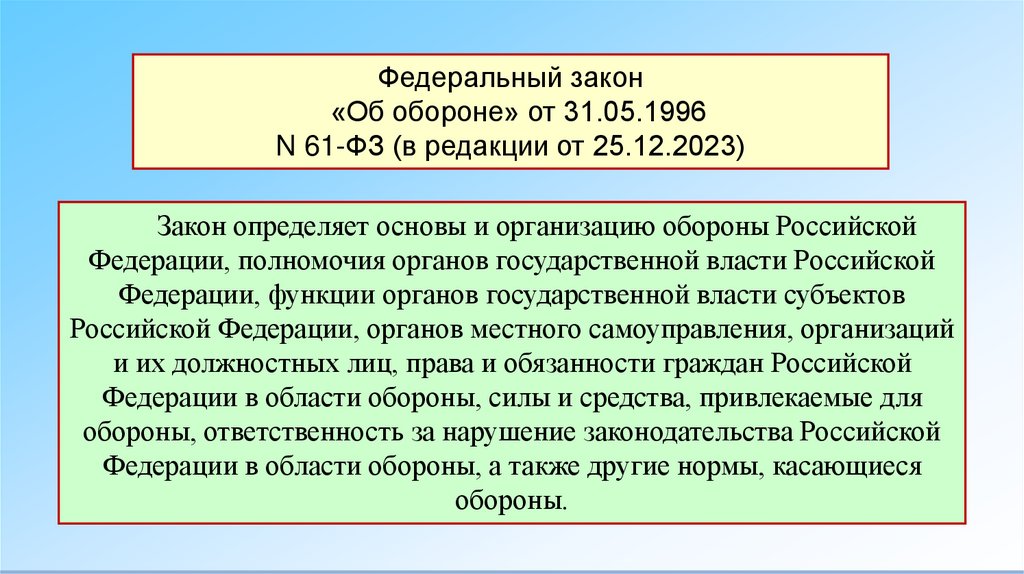 2. Федеральный закон от 31 мая 1996 г. № 61-ФЗ «Об обороне»;