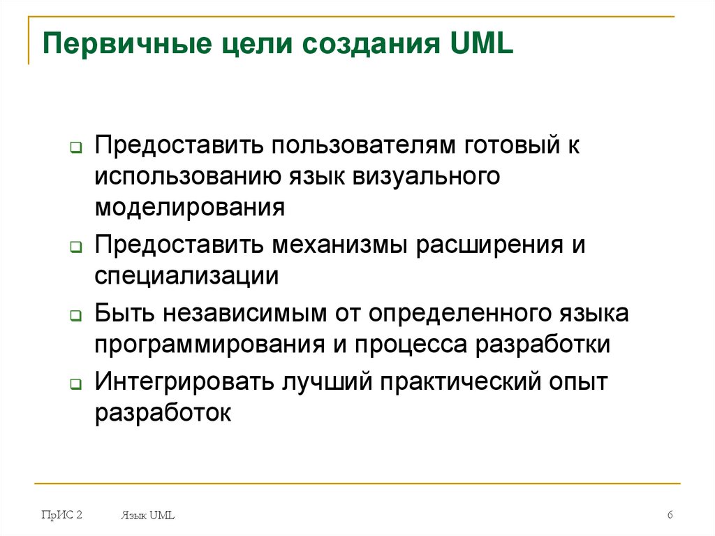 Первичные цели создания UMLПредоставить пользователям готовый к