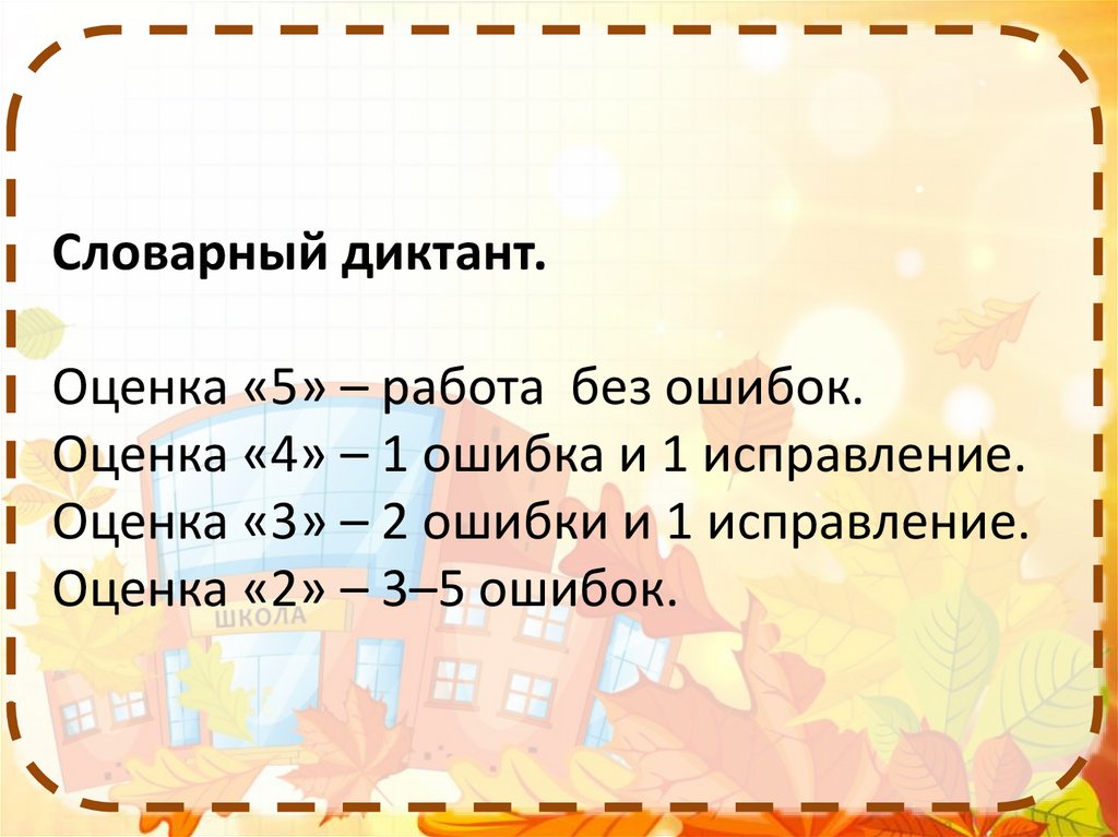 Словарный диктант.Оценка «5» – работа без ошибок.