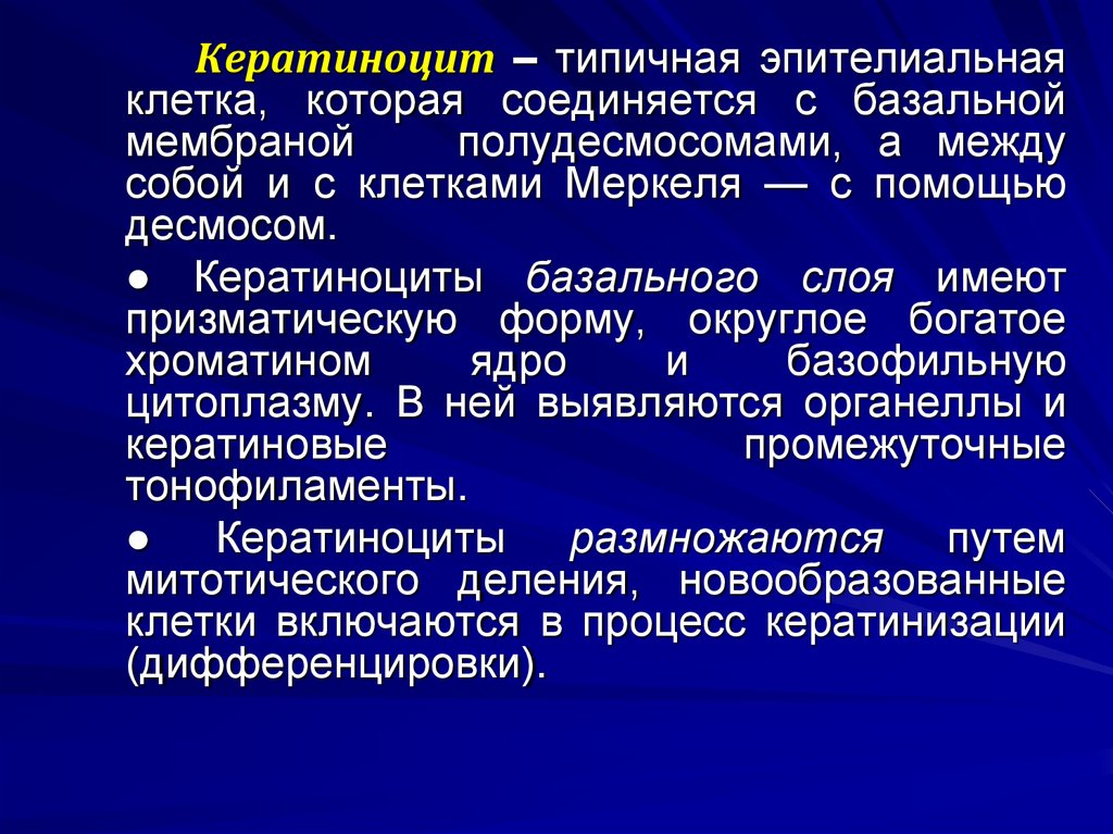 Кератиноцит – типичная эпителиальнаяклетка, которая соединяется с базальной