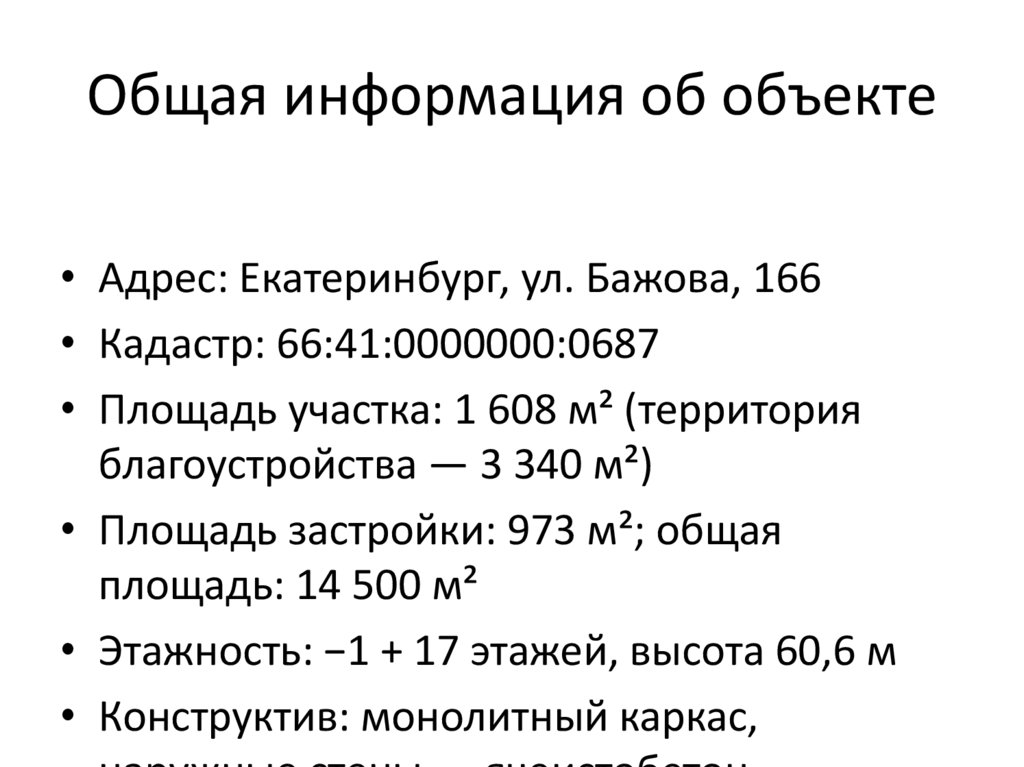 Общая информация об объекте• Адрес: Екатеринбург, ул. Бажова, 166