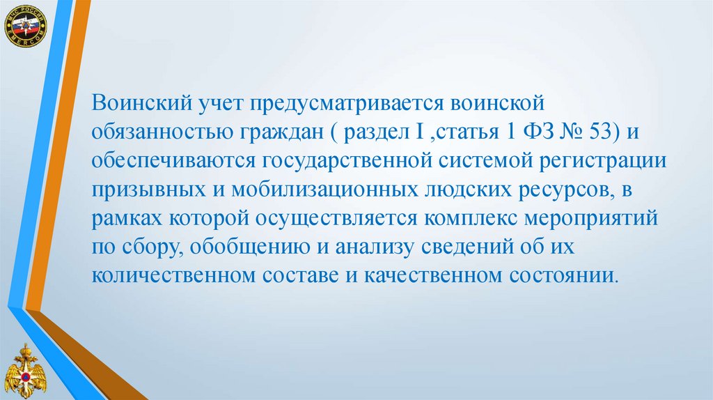 Воинский учет предусматривается воинскойобязанностью граждан ( раздел I ,статья 1 ФЗ № 53) и