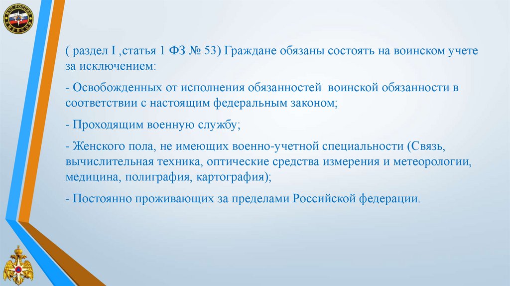 ( раздел I ,статья 1 ФЗ № 53) Граждане обязаны состоять на воинском учетеза исключением: