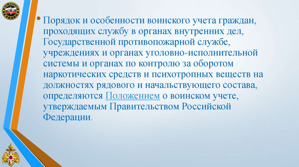 • Порядок и особенности воинского учета граждан,проходящих службу в органах внутренних дел,
