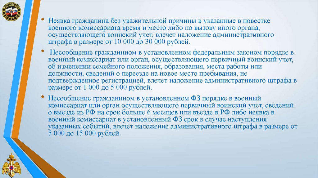 • Неявка гражданина без уважительной причины в указанные в повесткевоенного комиссариата время и место либо по вызову иного органа,