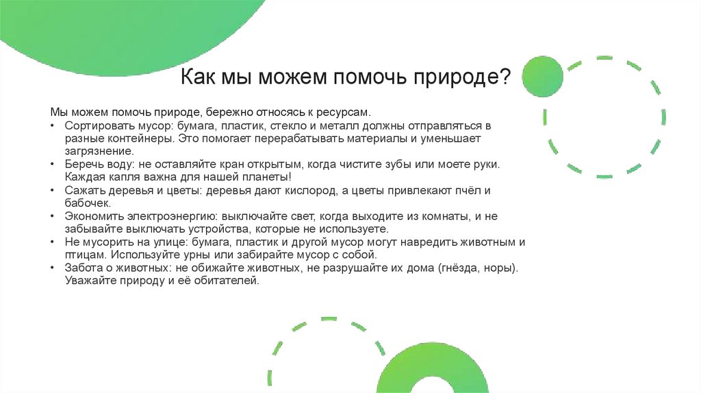 Как мы можем помочь природе?Мы можем помочь природе, бережно относясь к ресурсам.