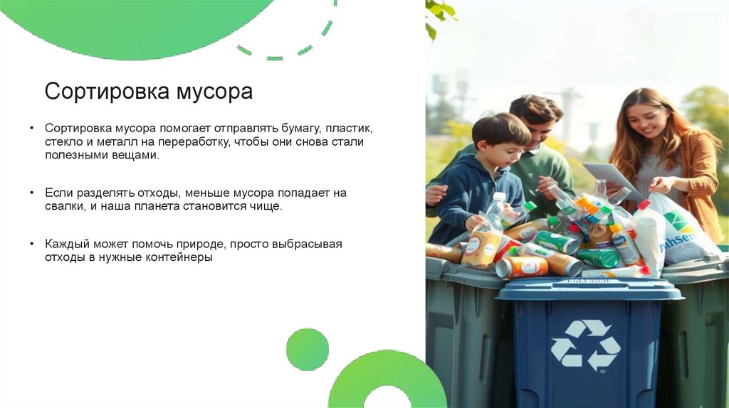 • Сортировать мусор: бумага, пластик, стекло и металл должны отправляться в