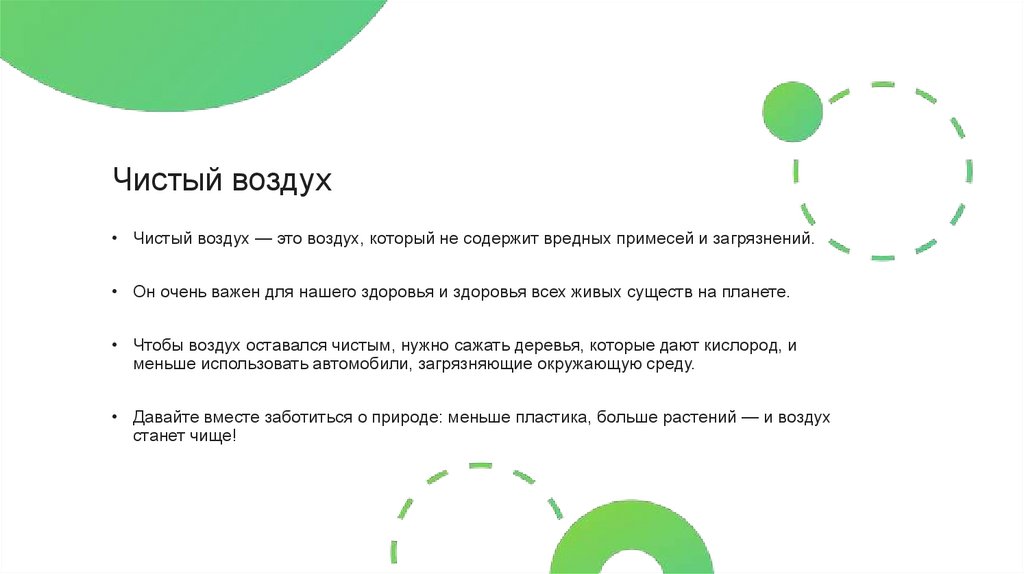 • Чтобы воздух оставался чистым, нужно сажать деревья, которые дают кислород, и
