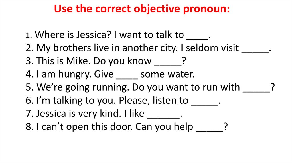 Use the correct objective pronoun:1. Where is Jessica? I want to talk to ____.