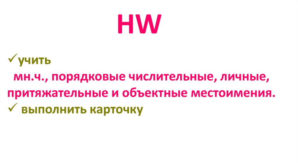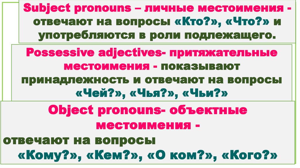 Subject pronouns – личные местоимения отвечают на вопросы «Кто?», «Что?» иупотребляются в роли подлежащего.