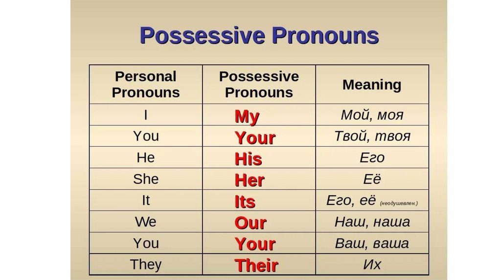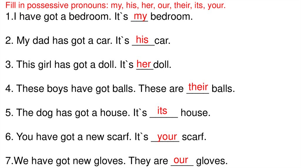 Fill in possessive pronouns: my, his, her, our, their, its, your.my bedroom.