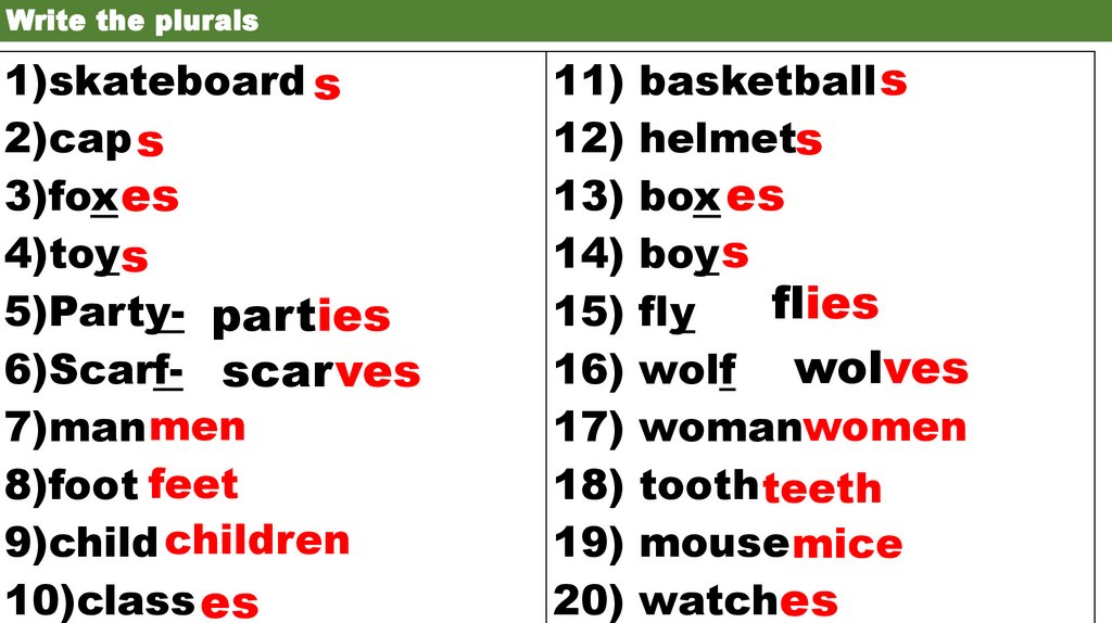 Если сущ. заканчивается на –s, -ch, -sh, -x, добавляем