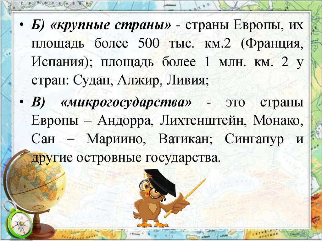 • Б) «крупные страны» - страны Европы, ихплощадь более 500 тыс. км.2 (Франция,